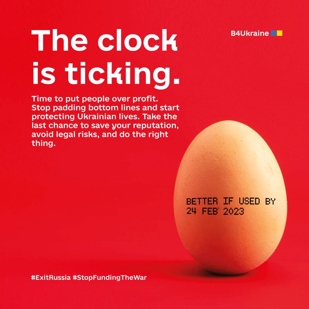 We, the members of B4Ukraine coalition, firmly believe: values cannot be treated as meaningless public relations statements, human rights are non-negotiable, and companies must be held accountable not just to the law but to the life and death demands of the Ukrainian people. Businesses that contribute to Russia’s war by paying taxes and supplying resources to Russia must leave now or be held to account.